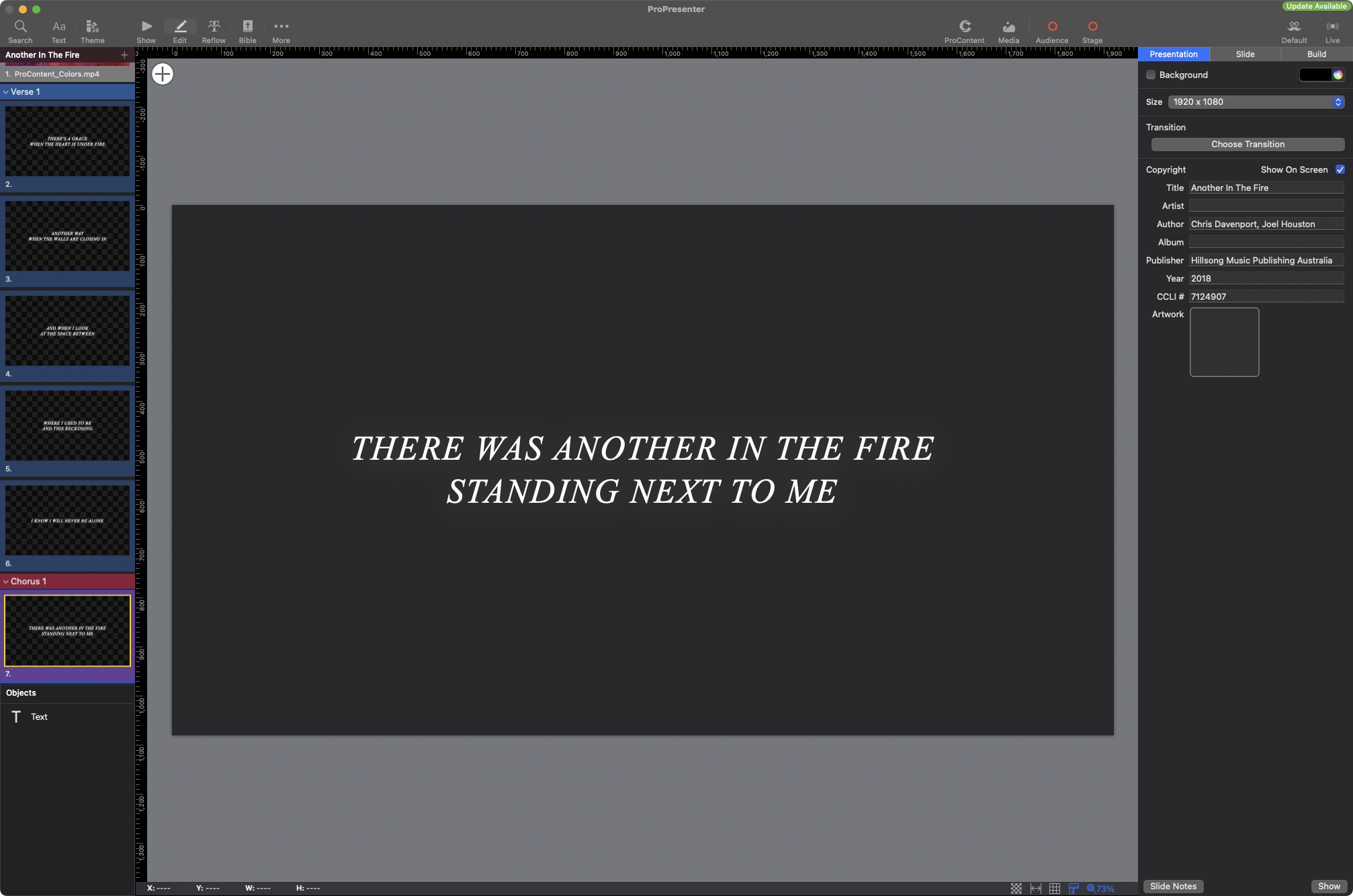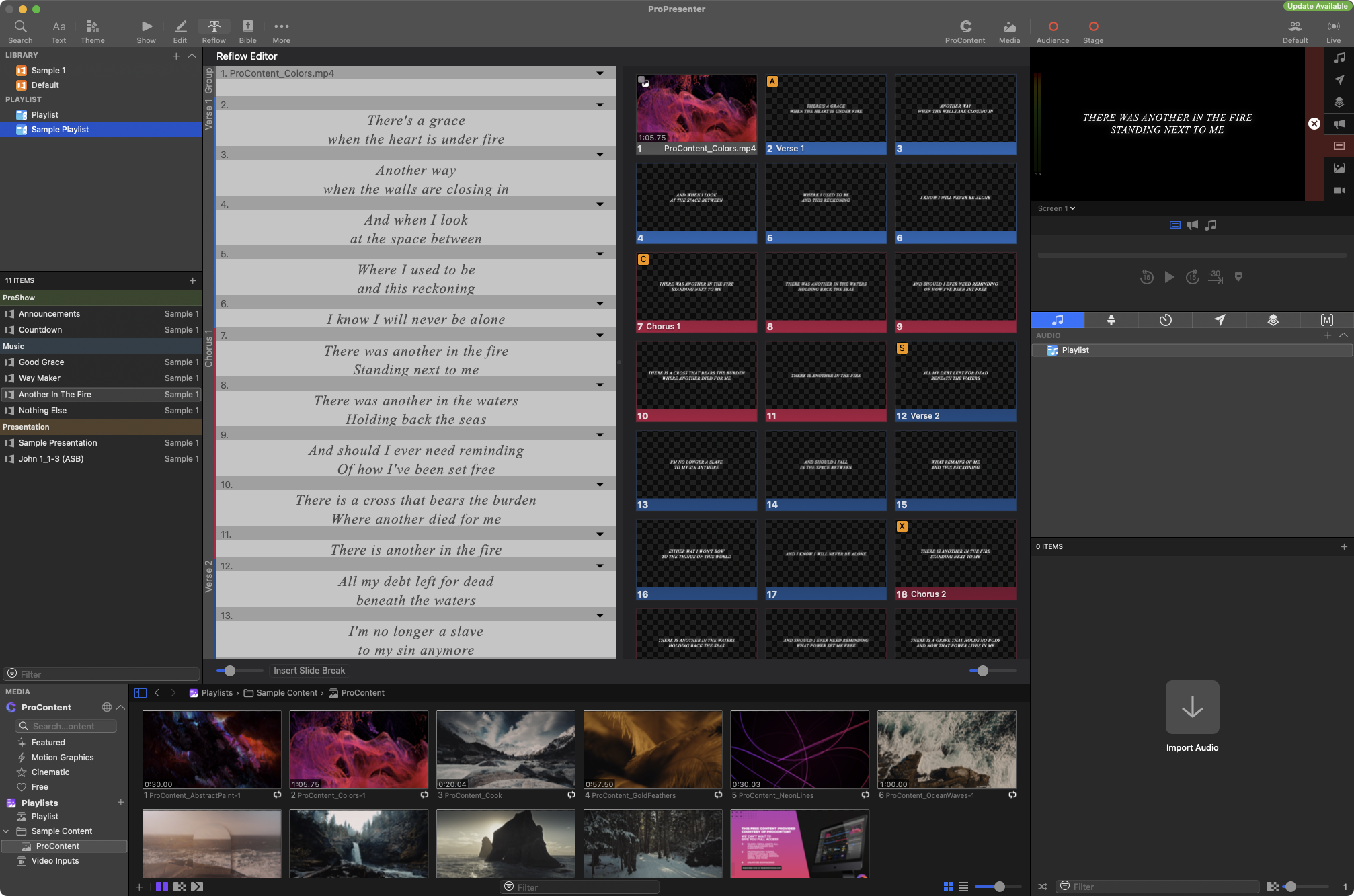 ProPresenter includes a Reflow Editor, a powerful tool that simplifies the editing of slide content, particularly text. This feature is especially useful when you need to make quick edits to the lyrics, scriptures, or other text-based content directly within the presentation workflow. The Reflow Editor presents all the text content of your presentation in an easy-to-read, continuous format, allowing you to edit text without having to navigate between individual slides.